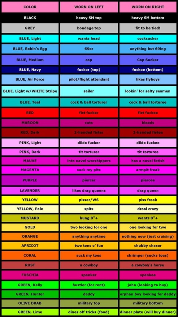 Gay men, who never lack for ingenuity in matters of sex, developed the Hanky Code. The idea is that gay men signal the specific sex acts they are seeking by wearing handkerchiefs in their back pockets (left for top/dominant, right for bottom/submissive). There is a lot of confusion around the Hanky Code these days. Nowadays it’s not too hard to find ‘guides’ to the Hanky Code like this one: