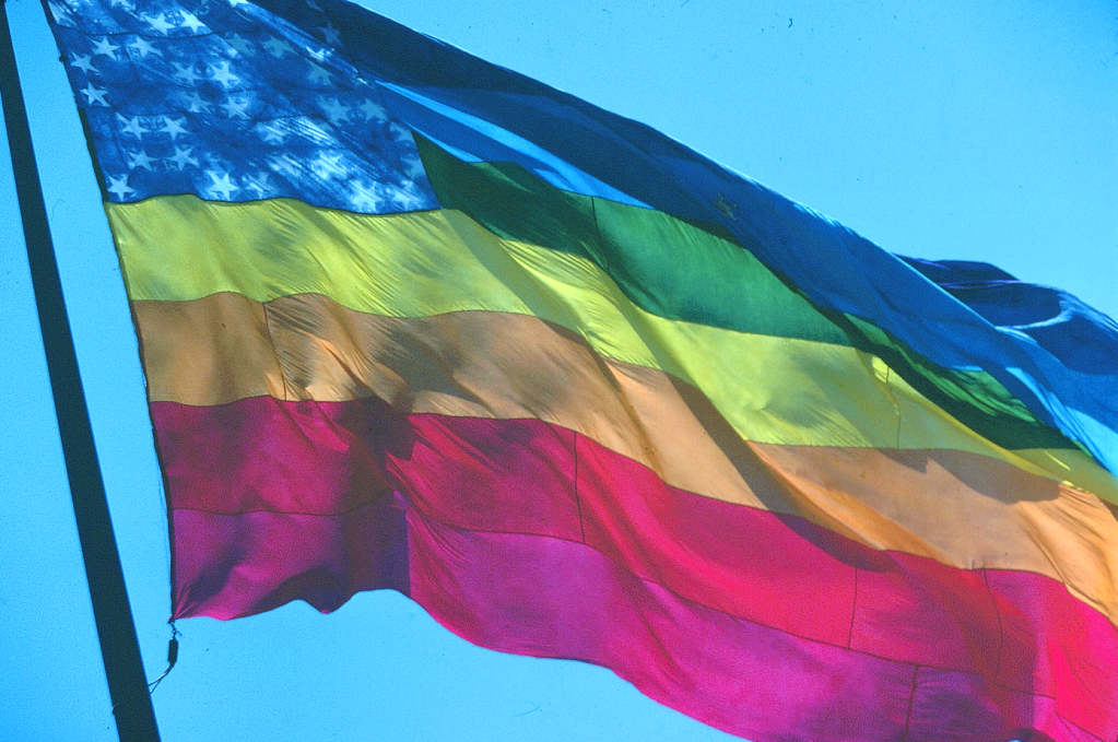 Baker was a political activist, fashion designer, and drag queen who had taught himself to sew after leaving the army in 1972 and then began making banners for the anti-war and gay rights movements. So after Milk and another man had encouraged him to create a symbol, he gradually settled on a rainbow because of its associations with the Hippie movement. Although some have speculated that he was inspired by “Somewhere Over the Rainbow” (Judy Garland having become an icon for Silent Generation and Boomer gays), Baker said that The Rolling Stones song “She’s a Rainbow” was more of an influence.