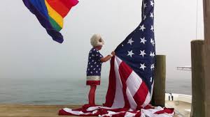 Baker as Busty Ross, raising an American flag on Fire Island